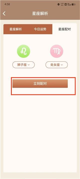 2、页面内提供星座解析、今日运势及配对测试,点击配对功能开始操作。