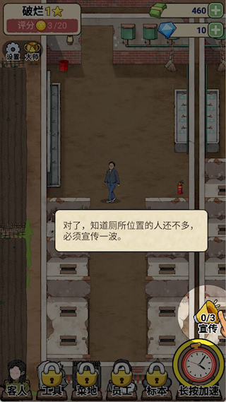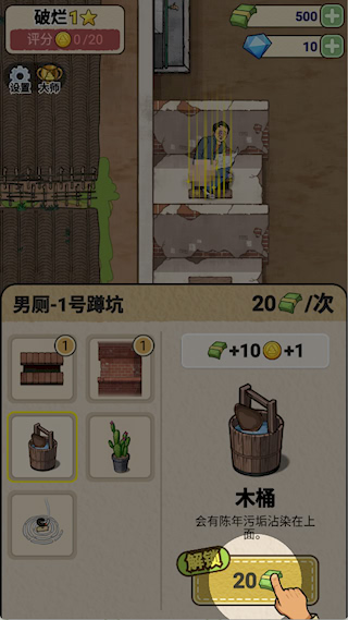1、设施修缮升级:开局修复破损设施,如门板、水龙头等,随资金增加,将蹲便器升级为坐便器,安装自动感应洗手设备提升顾客满意度。