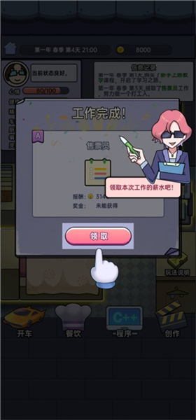 这里有着四种赚钱的方法,开车、餐饮、程序员、创作,先说说前面三样,这三样玩家都要开始学习才能找到工作,毕竟提升自己的专业技能,才能找到更好的工作,在创作中,玩家可以选择创业,这也是一个不错的开始哦!