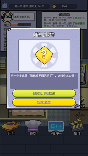 游戏过程中、工作、娱乐均会有概率触发不同的随机事件,选择事件后也会产生不一样的结果,而这些结果可能会带来不同的奖励和惩罚。