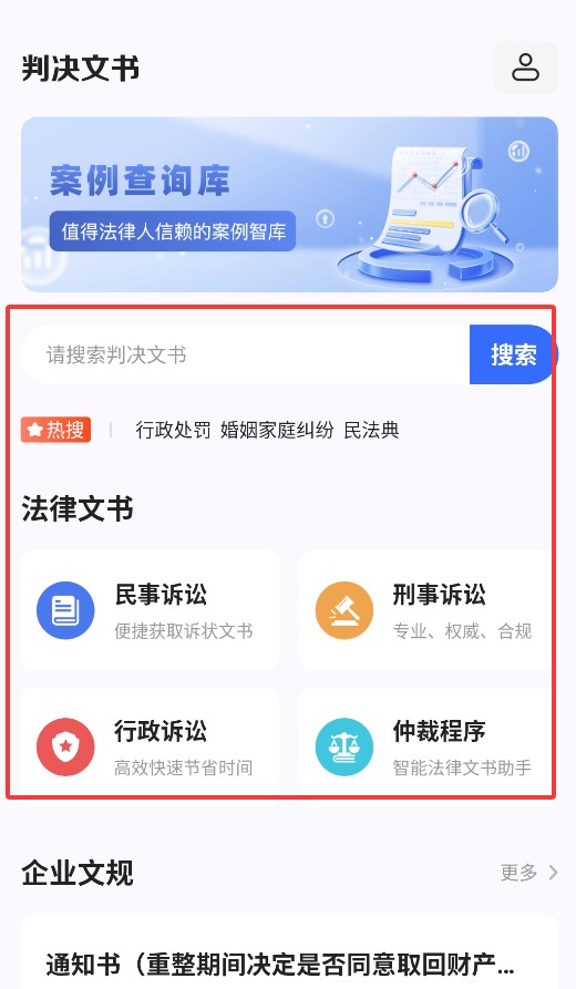 2、首页支持关键词搜索判决书,涵盖民事、刑事及仲裁等法律文书类型。