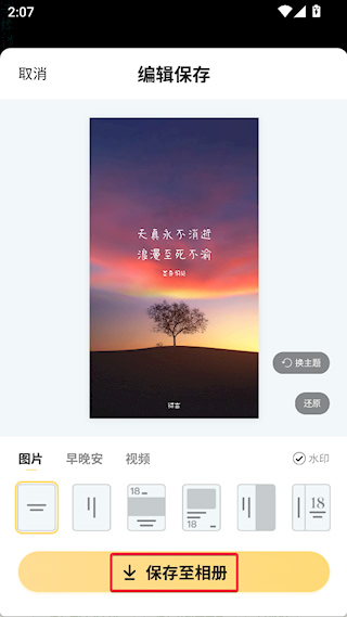 2、壁纸制作功能:支持选取语录与图片融合,通过内置主题编辑,生成兼具文字美感与个性化的手机壁纸。