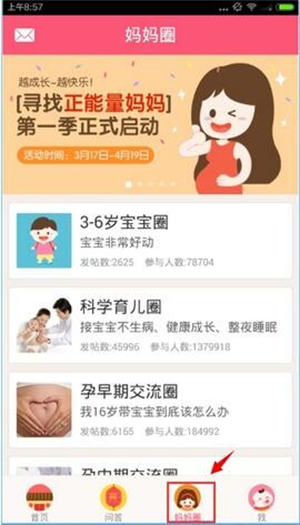 5、进入妈妈圈,可查看其他妈妈分享的孕儿、育儿内容;也能在妈妈圈发帖,分享自家宝宝的每日成长历程。