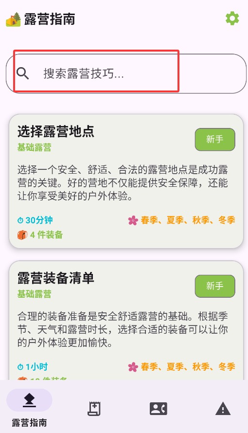 2、在露营指南板块,可通过搜索功能查找露营技巧、装备推荐及安全须知等内容。