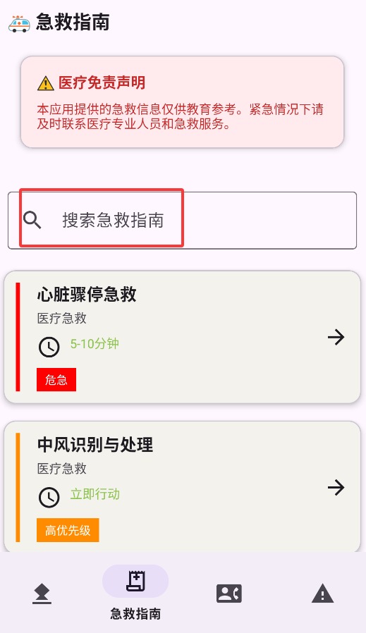 3、通过急救指南专区,可搜索各类医疗急救处理方法,如伤口处理、中暑应对等。