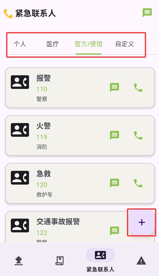4、进入紧急联系人页面后,可查看预设的个人、医疗及官方电话,支持自定义添加新联系人。
