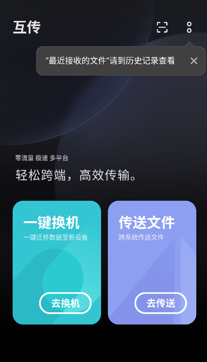 选择功能:根据你的需求(换机或传文件),选择对应功能模块。