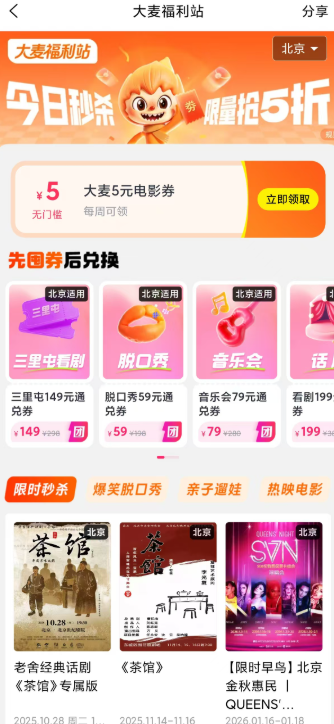 4.就可以看到各种福利券,各种脱口秀,电影,话剧等限时秒杀价格。