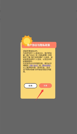1、初次启动应用时,需阅读并同意用户服务协议及隐私条款,点击确认后进入主界面。