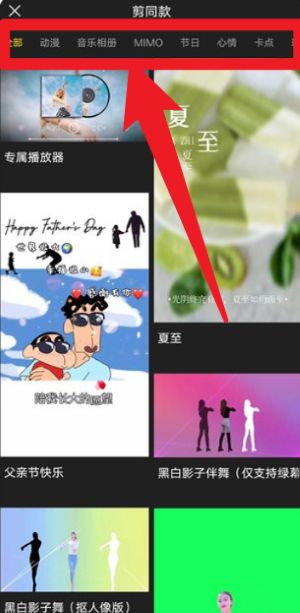 3、在剪同款模块内,可选择不同类型的剪辑风格分类,如动画、音乐相册、节日等,适配各种拍摄主题内容。