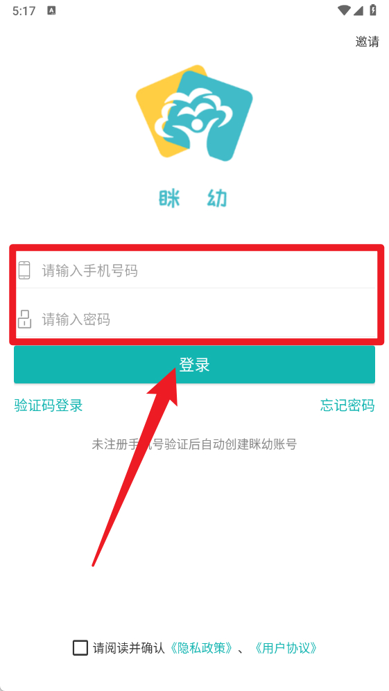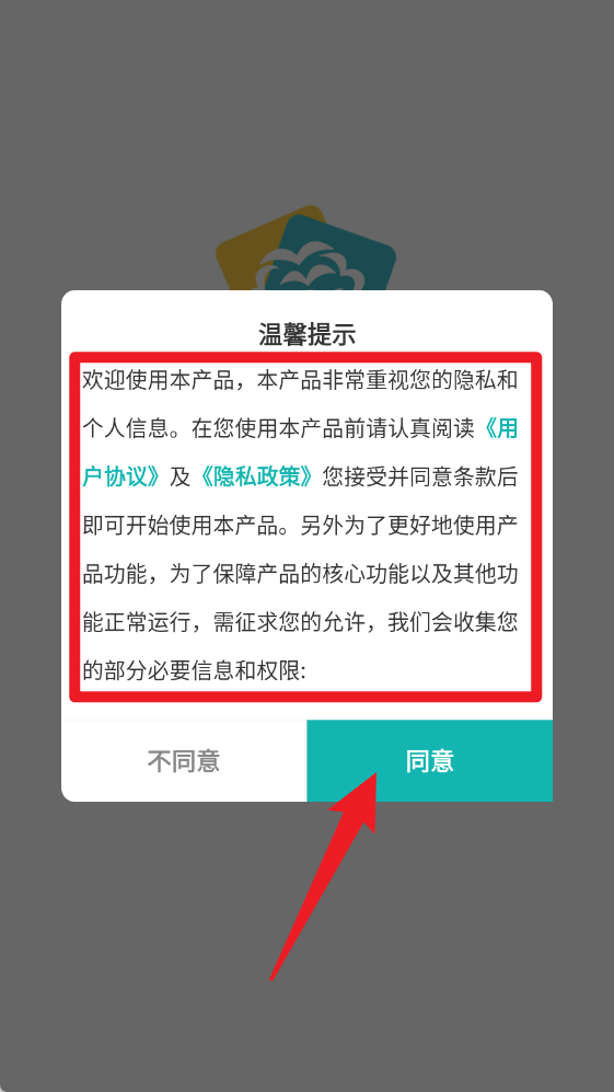 1、首次打开眯幼,阅读并同意《用户协议》和《隐私政策》,点击同意进入。