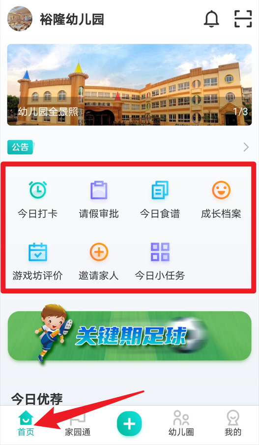 3、进入首页后,可以查看今日打卡、请假申请、今日食谱、成长档案等常用功能。