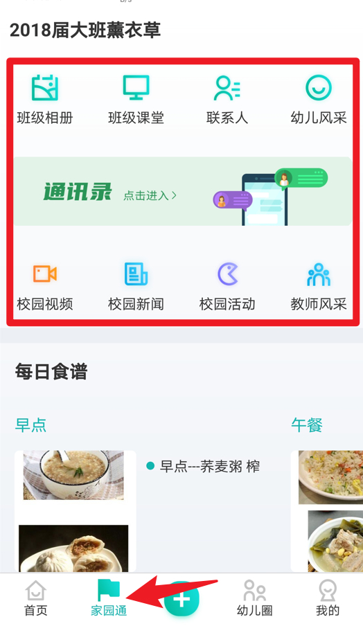 4、切换到家园通栏目,可访问班级相册、课堂、联系人、校园视频、校园活动等内容。