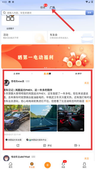 2、广场页面支持内容搜索,展示车主动态与平台推荐的活动信息。