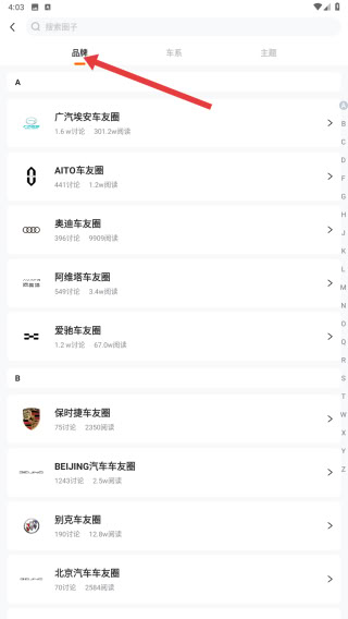 3、车圈页面按品牌分类排列,可查看各品牌社群的讨论热度与具体内容。