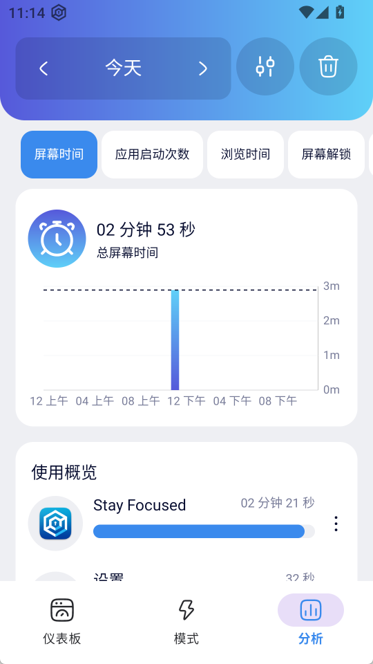 3、【分析】界面可以查看各个应用的使用时长统计