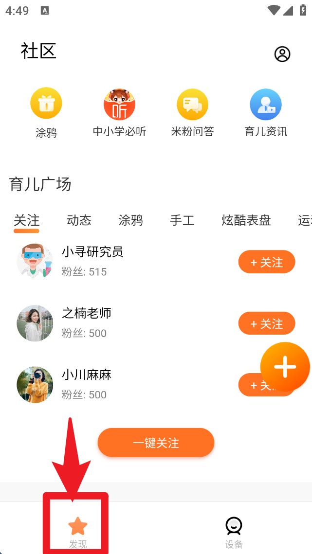 1. 进入App后点击底部导航栏的发现按钮,即可浏览社区内容和推荐的育儿话题。