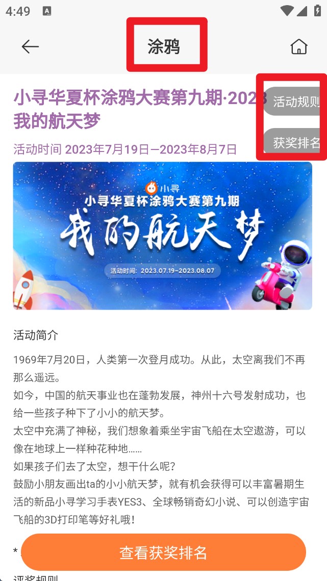 2. 在社区中选择涂鸦栏目,可以查看当前活动、阅读规则或点击查看获奖排名。