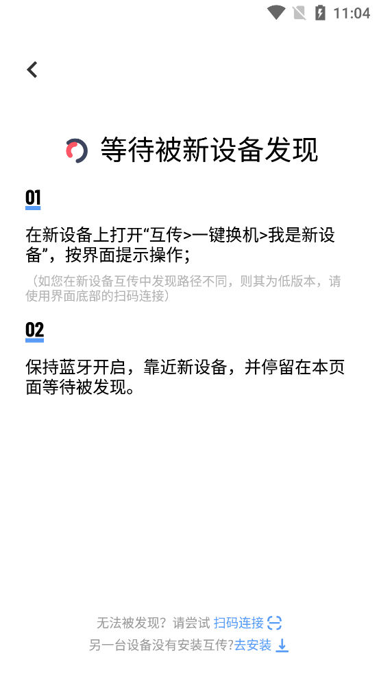 2、资料发送端选择“我是旧设备”--资料接收端选择“我是新手机”--挑选设备品牌--等候识别结束或扫描界面二维码链接--确认