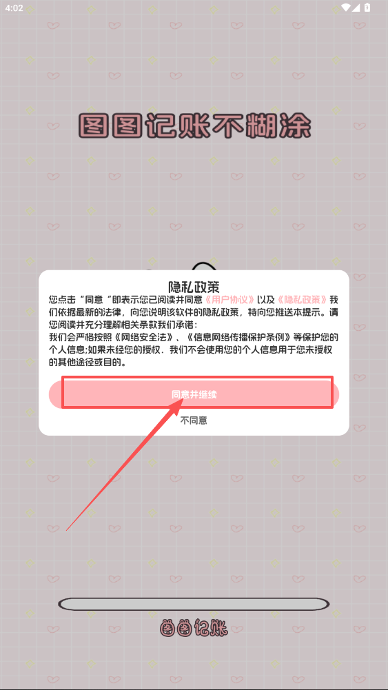 1、点击进入猫狗记账app,点击“同意并继续”