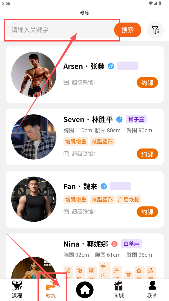 3、查看健身教练介绍,包括证书资质、授课门店及过往经验,方便挑选更专业的指导人员。
