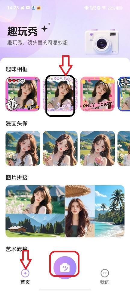 1、进入趣玩秀首页,找到图片相框选项点击,同时首页也提供拍照功能供选择。