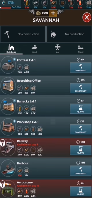 3、 城建升级与基础布局、所有城市建筑均需逐步升级,优先在各省设立招聘办公室(保障人口供给),在半数省份及 1-2 个核心军营旁建造车间(平衡工业产能与军事动员效率),构建生产 - 动员基础体系。