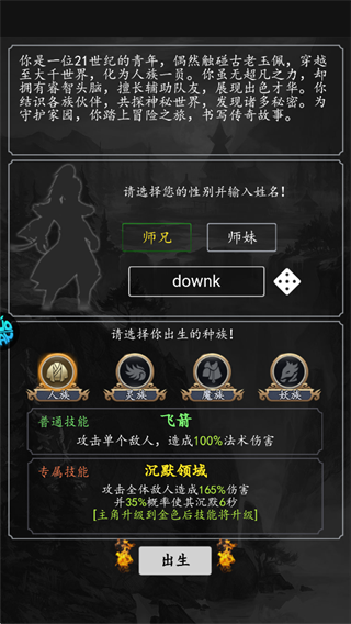 1、角色创建、选择性别(师兄 / 师妹)并输入姓名,从人、灵、魔、妖四大种族中挑选,不同种族技能体系各异,需结合战斗偏好选择。