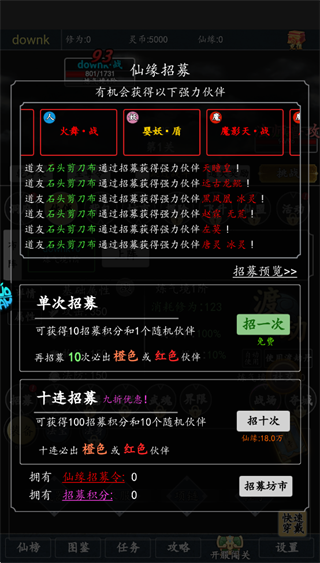 3、伙伴招募、通过 “仙缘招募” 获取伙伴,单次招募有机会得强力角色,十连招募必出橙色或红色品质伙伴,优先积累资源十连。