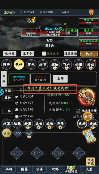 5、境界渡劫、当修为积累至瓶颈时,触发九重天劫挑战,成功渡劫即可提升境界,解锁更多玩法与属性加成。