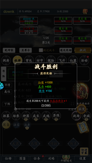 6、副本挑战、参与副本对战,胜利可获取仙缘、灵币、修为等资源;通关至 200 关时,可领取红色伙伴令,用于兑换高阶伙伴。