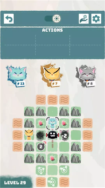 1、核心主题氛围、以可爱猫咪为主角,引导其通过网格关卡恢复森林生机,萌趣形象搭配清新画风,营造轻松治愈氛围。
