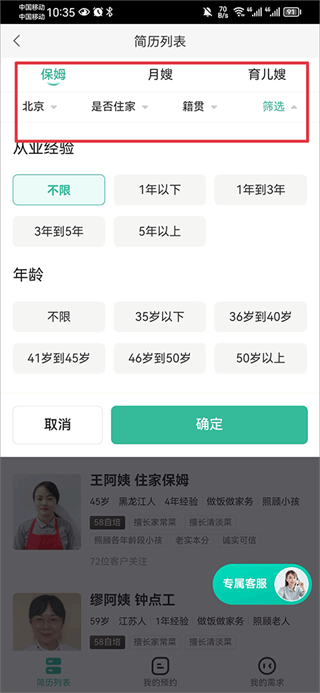 2、进入后从简历列表中挑选保姆、月嫂或育儿保姆,并在下方筛选条件中设定标准