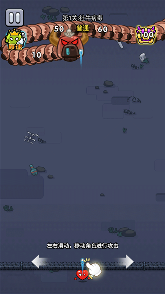 1、操控方式说明、进入后按住角色,左右滑动屏幕控制移动与射击,操作简单且节奏感十足,易上手。