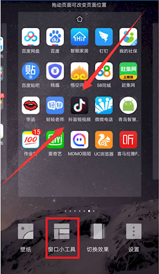 1.打开手机界面,用食指和大拇指如图所示进行滑动,此时下方出现“窗口小工具"图标,点击“窗口小工具"可以看到有知很多小工具,在下方位置用手指往右边滑动