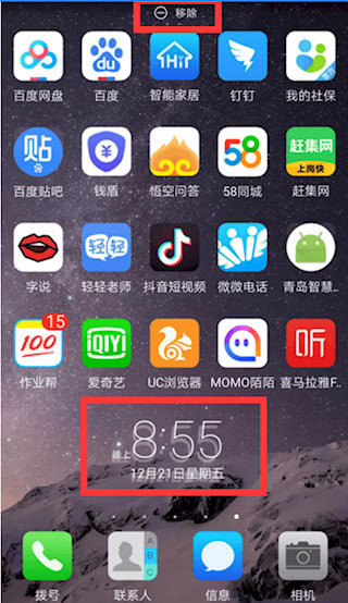 3.想要删掉这个小工具的话,可以拖动时钟到“移除"的位置上面就可以将时钟小工具删掉了