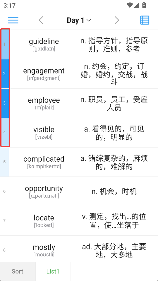 4、单词左侧会根据点击频率显示不同深度的颜色