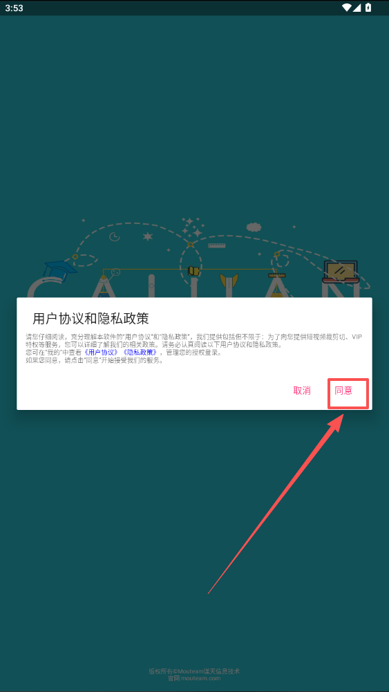 1、点击裁剪切视频app进入软件,跳出的页面点击“同意”