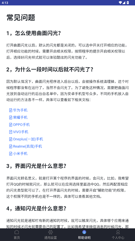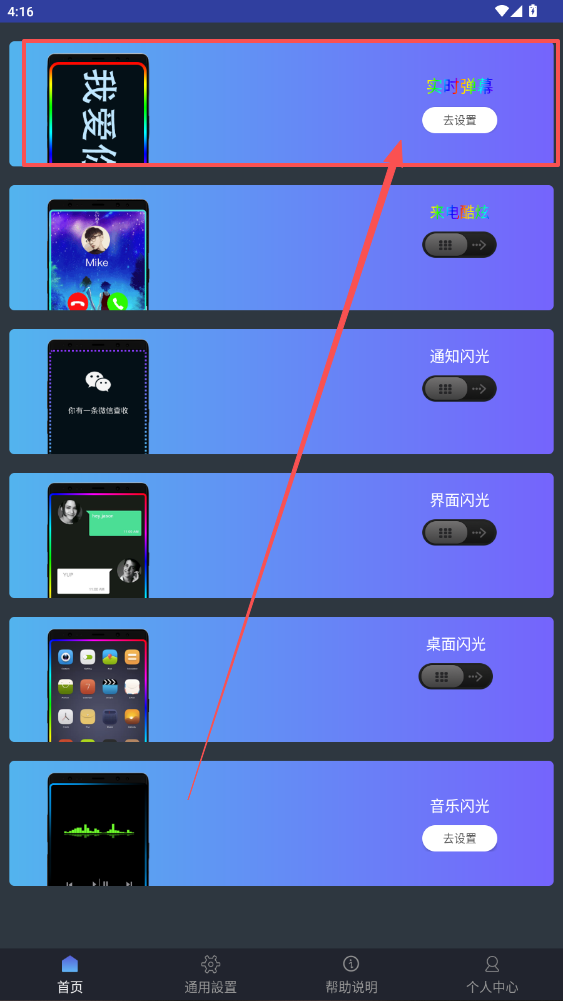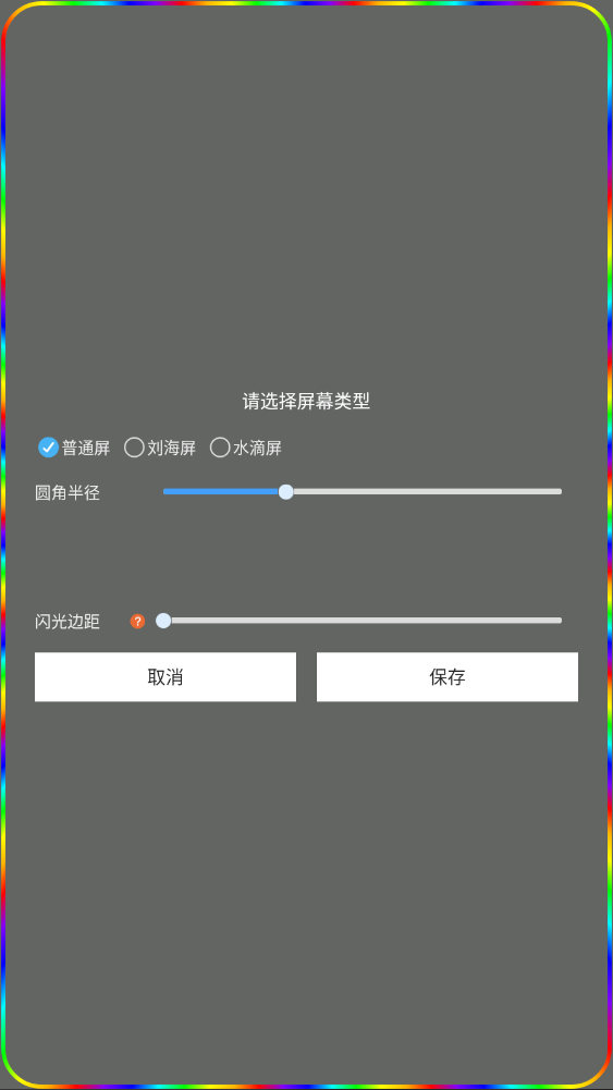 在任意应用开启首页时,会触发边缘跑马灯效果。提供七彩、截断、动感呼吸灯、对流、两边、贪吃蛇、两边呼吸灯、四周呼吸灯等闪光样式,可按需选择并设置闪光时长。