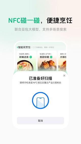 1、搭载NFC近场通信技术,食材接触感应区即可自动启动预设烹饪程序;升级版支持NFC与WiFi双模互联,触碰瞬间完成设备配网。