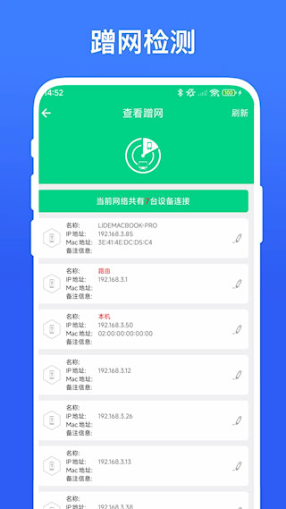 1、路由助手支持完整的局域网设备扫描与识别功能,可实时显示连接设备的IP地址、MAC地址及设备类型。支持自定义设备备注信息,便于区分各类智能设备。