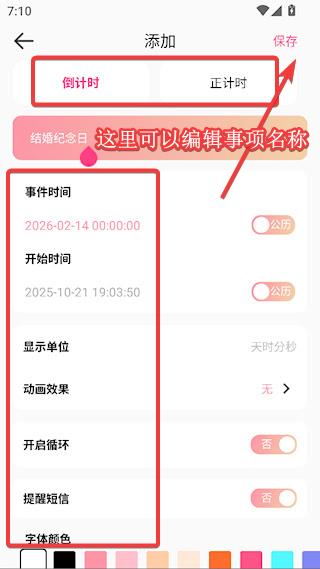 3、如图,可设置倒计时、正计时,编辑事项、时间、颜色等,标记好后记得点击右上角【保存】