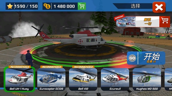 5、抵达驾驶舱后,从数十种直升机中挑选机型,选定后点击 “GO 开始” 启动任务;
