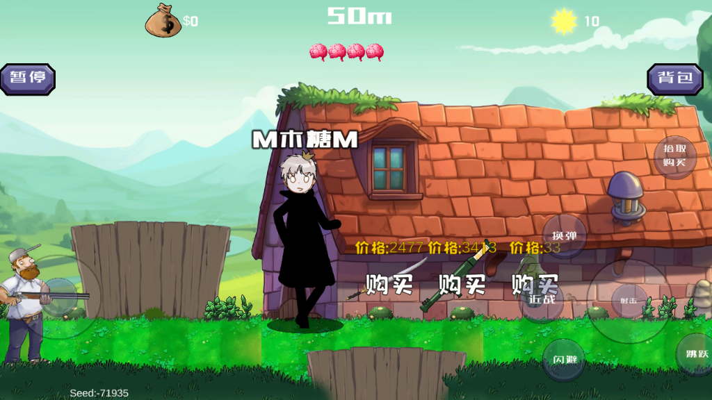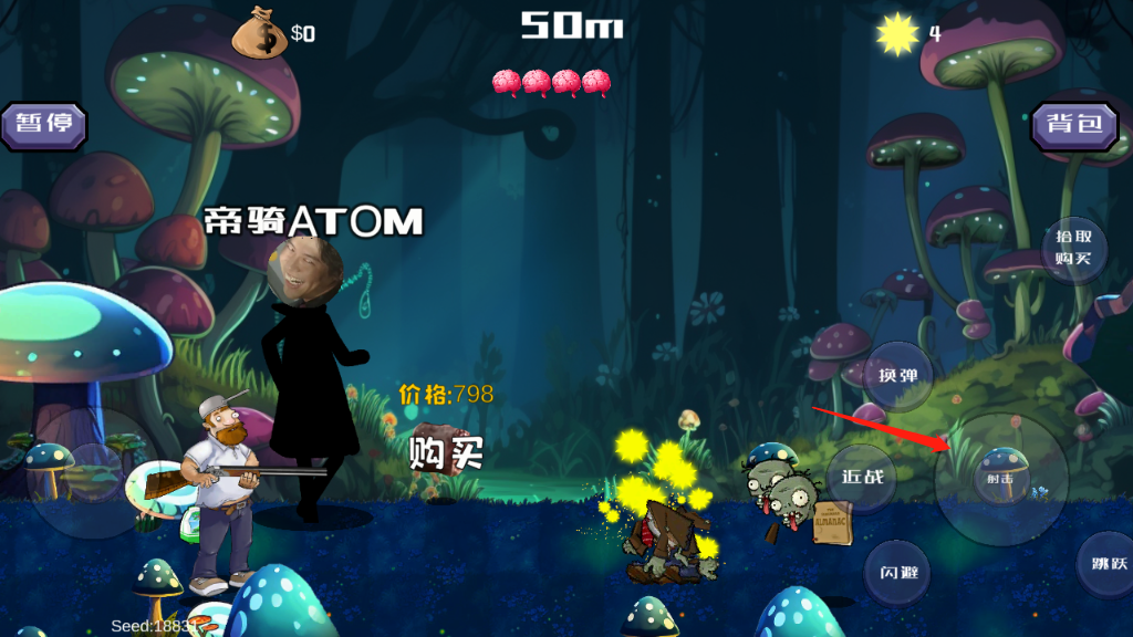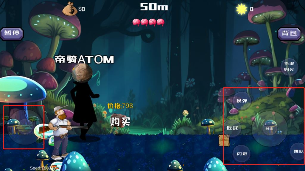 2、操作界面左侧控制角色移动,右侧负责攻击僵尸;中间上方 “脑子” 图标代表生命值,生命值耗尽则游戏结束;