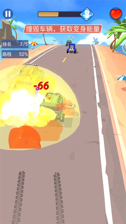 2、在赛程中撞毁其他车辆,争夺比赛胜利,同时积累能量以解锁变身能力;