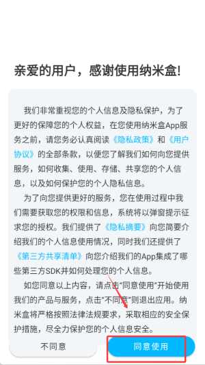 1、首次启动需阅读并确认用户协议,点击同意按钮后即可进入应用主界面开始使用。