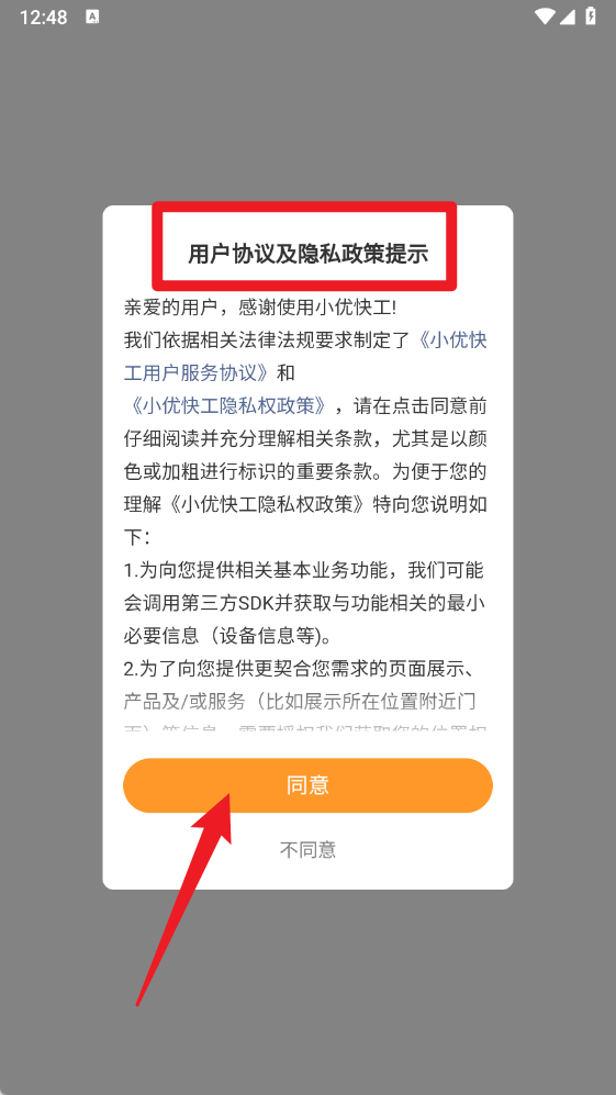 1、首次进入小优快工APP时,会弹出《用户协议及隐私政策提示》,用户需点击同意按钮后才能继续使用。