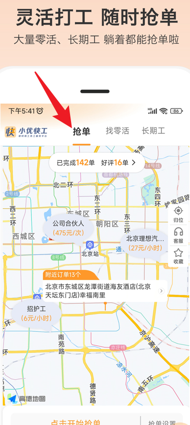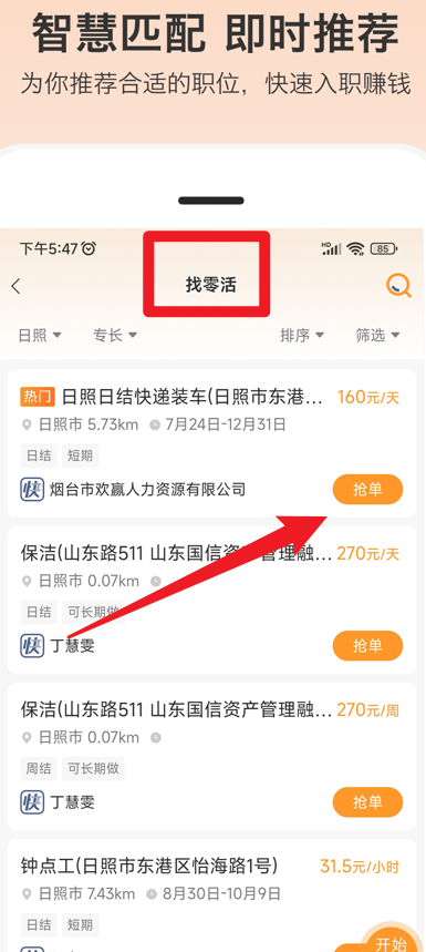 3、在抢单板块,用户可查看附近零工岗位信息,选择合适的工作点击抢单,实现灵活接单。