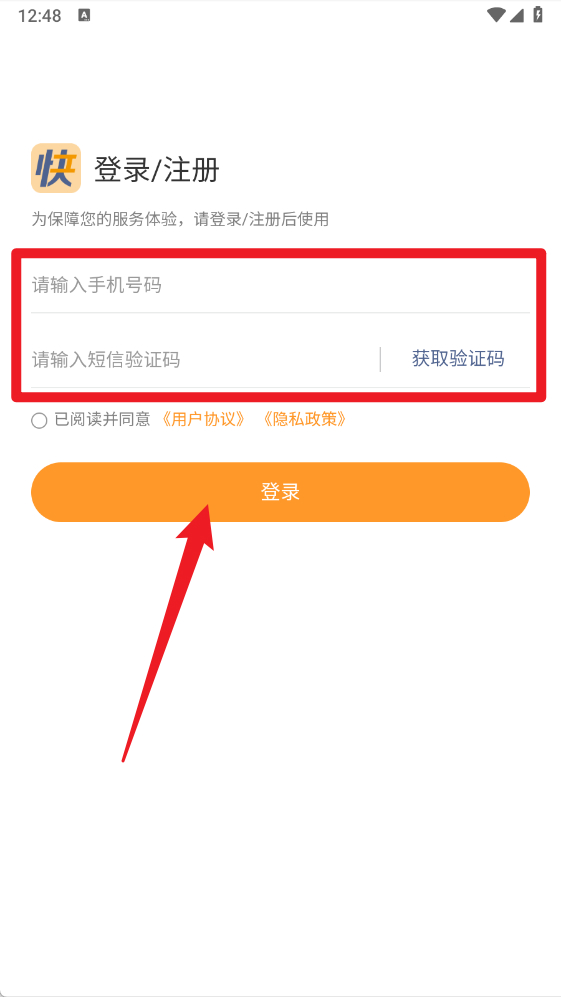 2、在登录/注册界面,输入手机号并获取短信验证码,填写后点击登录,即可进入应用。