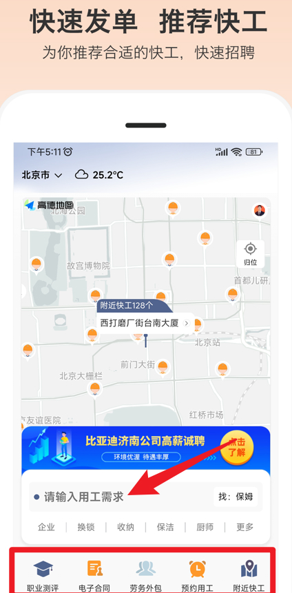 5、在首页底部功能区,提供职业测评、电子合同、商务外包、预约用工等多种服务,满足企业和个人多样化需求。